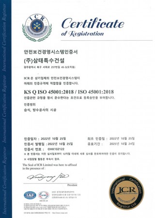 (주)삼태특수건설, KS Q ISO 45001:2018 / ISO 45001:2018